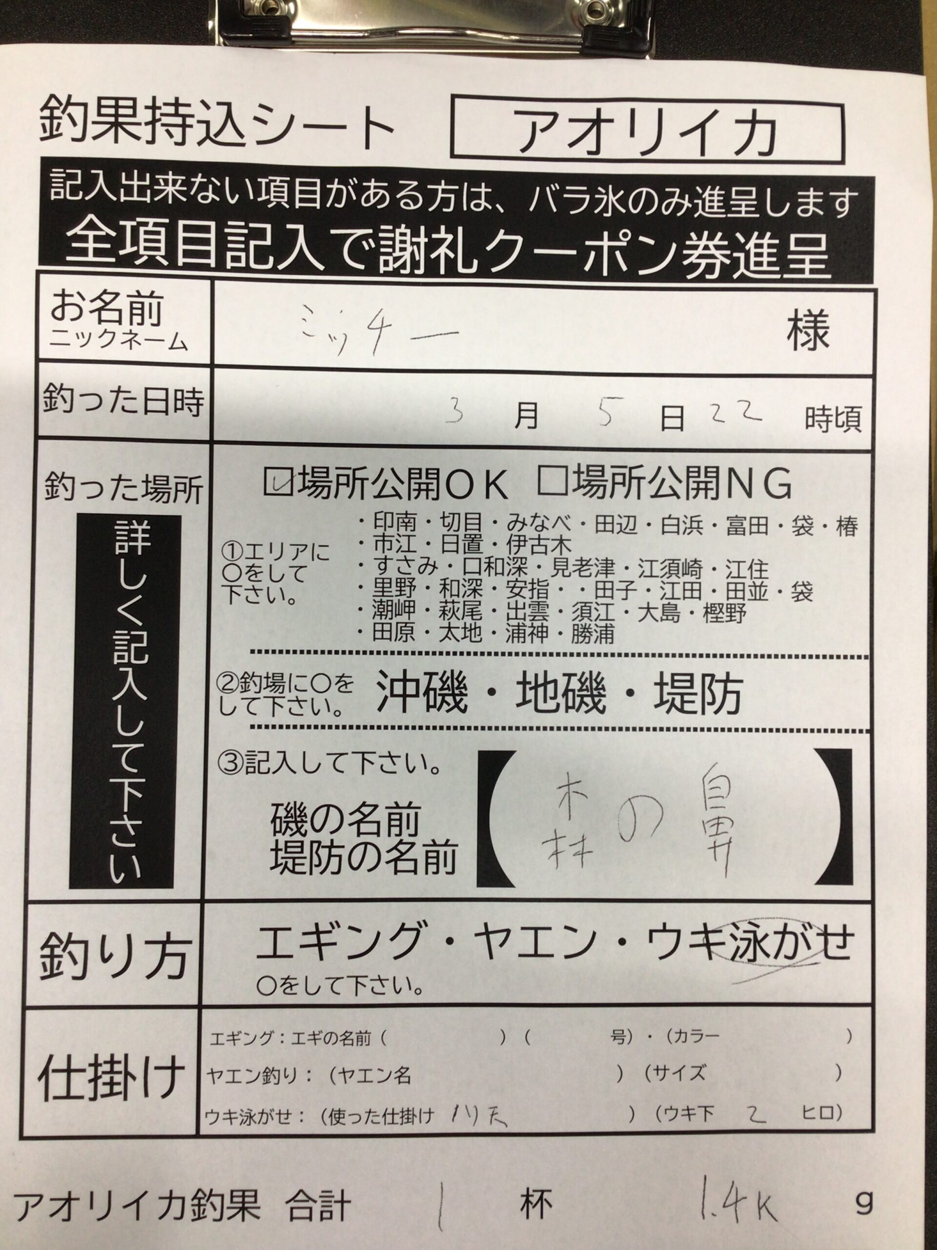 3/5森の鼻で1.4Kのアオリイカ釣果あがってます!