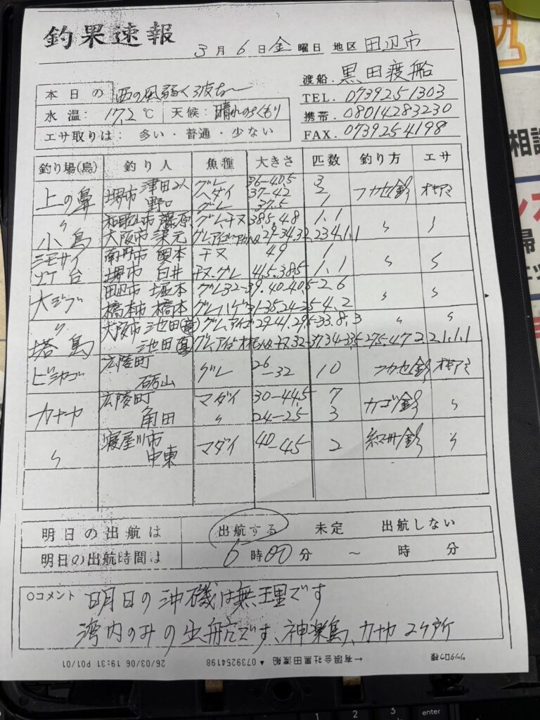 3月6日 田辺の黒田渡船 釣果情報。
