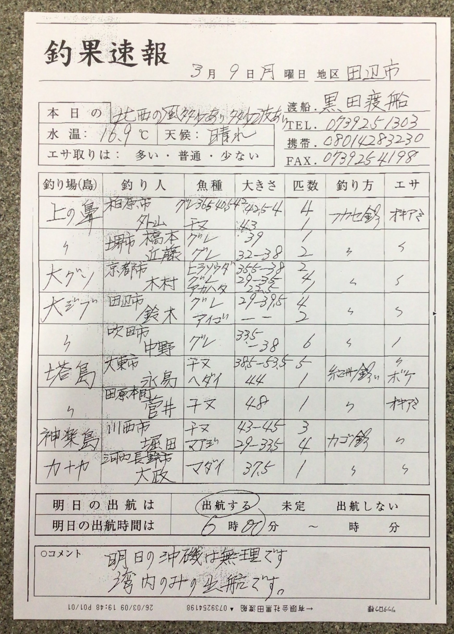 3月10日(火)田辺・黒田渡船さん湾内のみとなっております
