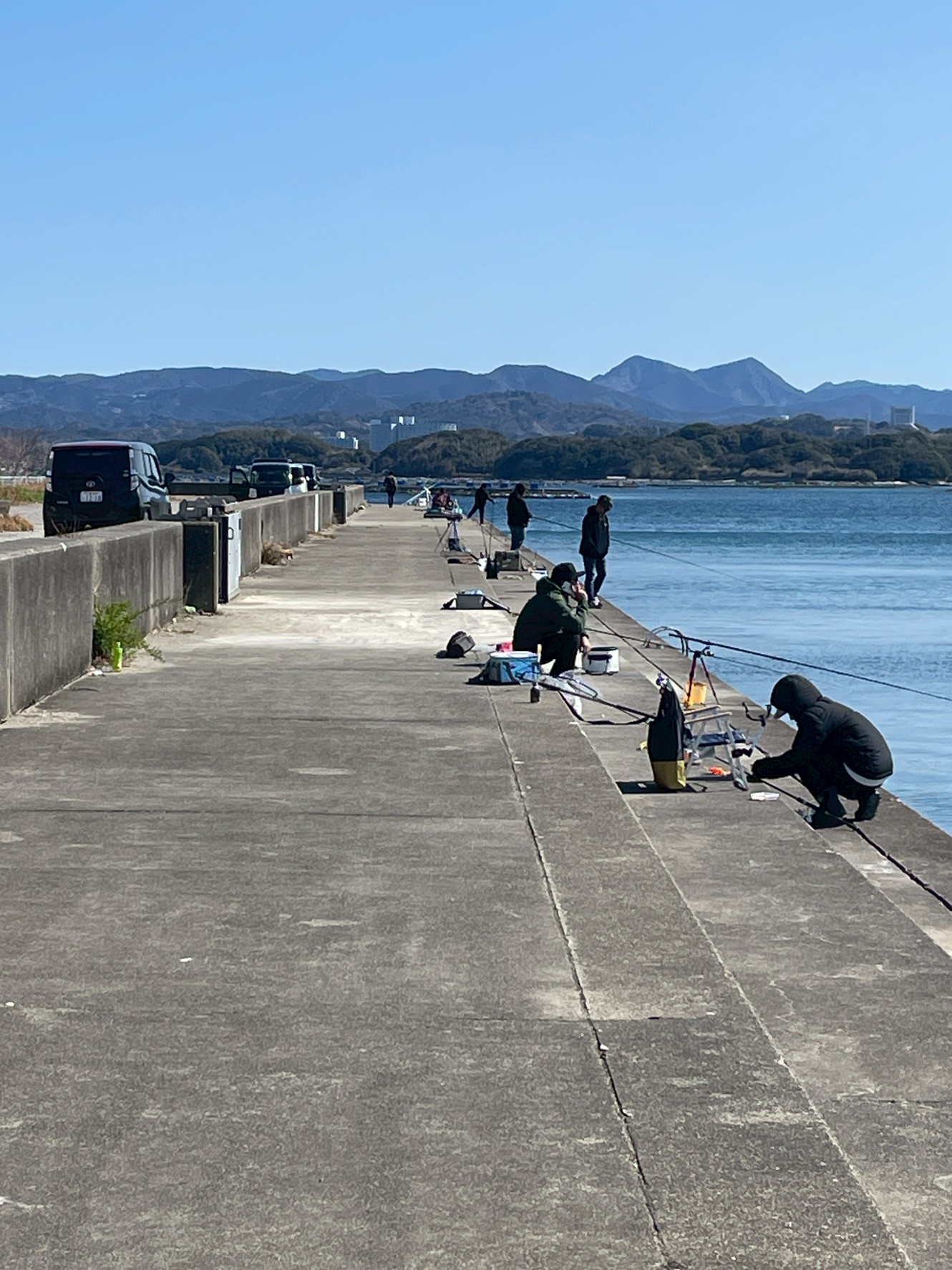 3/15 川久裏の護岸の様子 釣り場紹介 2026.03.16 日曜日という事もあり 釣り人で賑わっています。 真鯛狙い、ヤエン釣り、サビキ釣りの家族連れと それぞれの釣りを楽しんでいるようでした 気温は12℃と、まだ少し寒かったです 車がここまで入れるので、とても便利です。