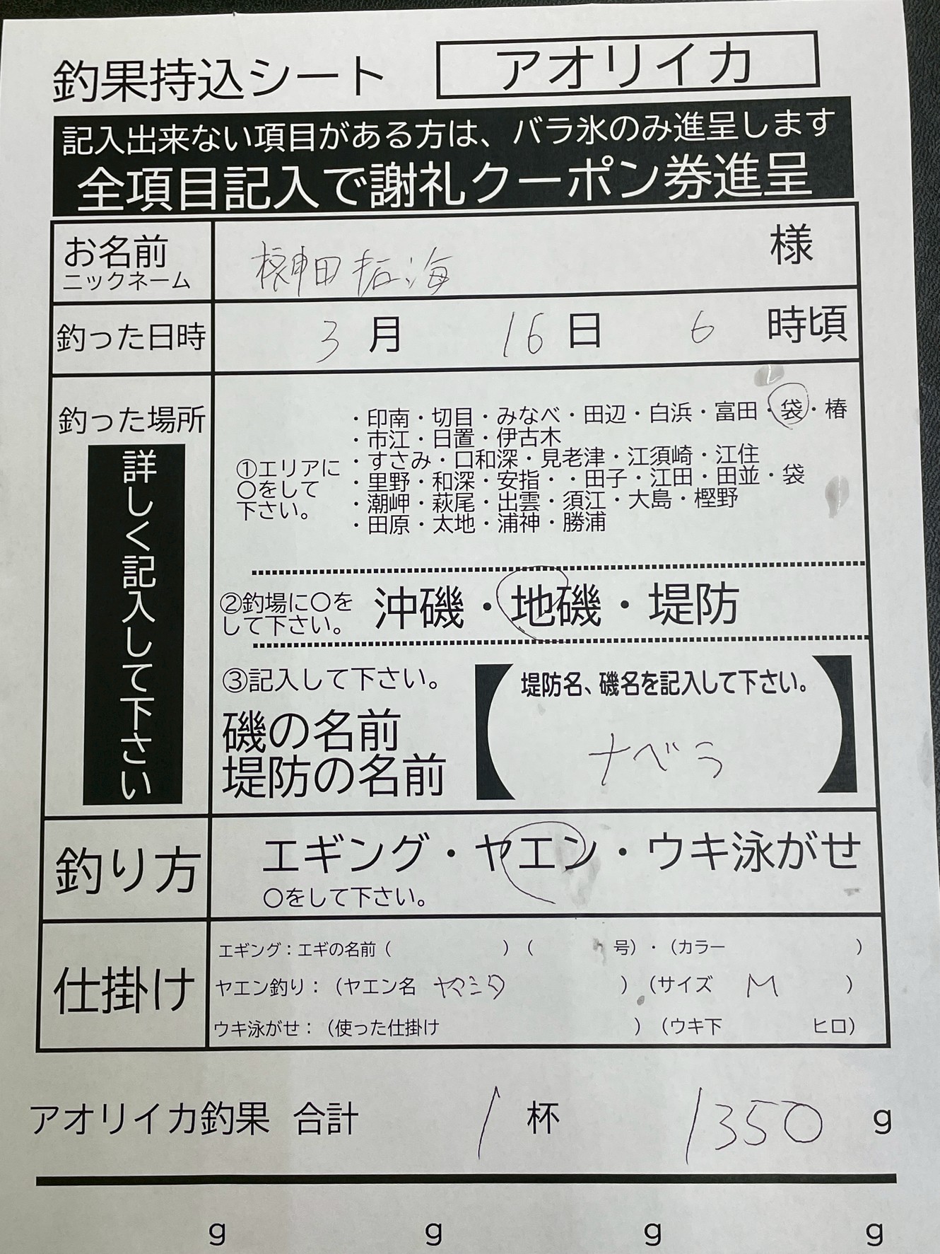 3/16 白浜町袋地磯でアオリイカ ヤエン釣り