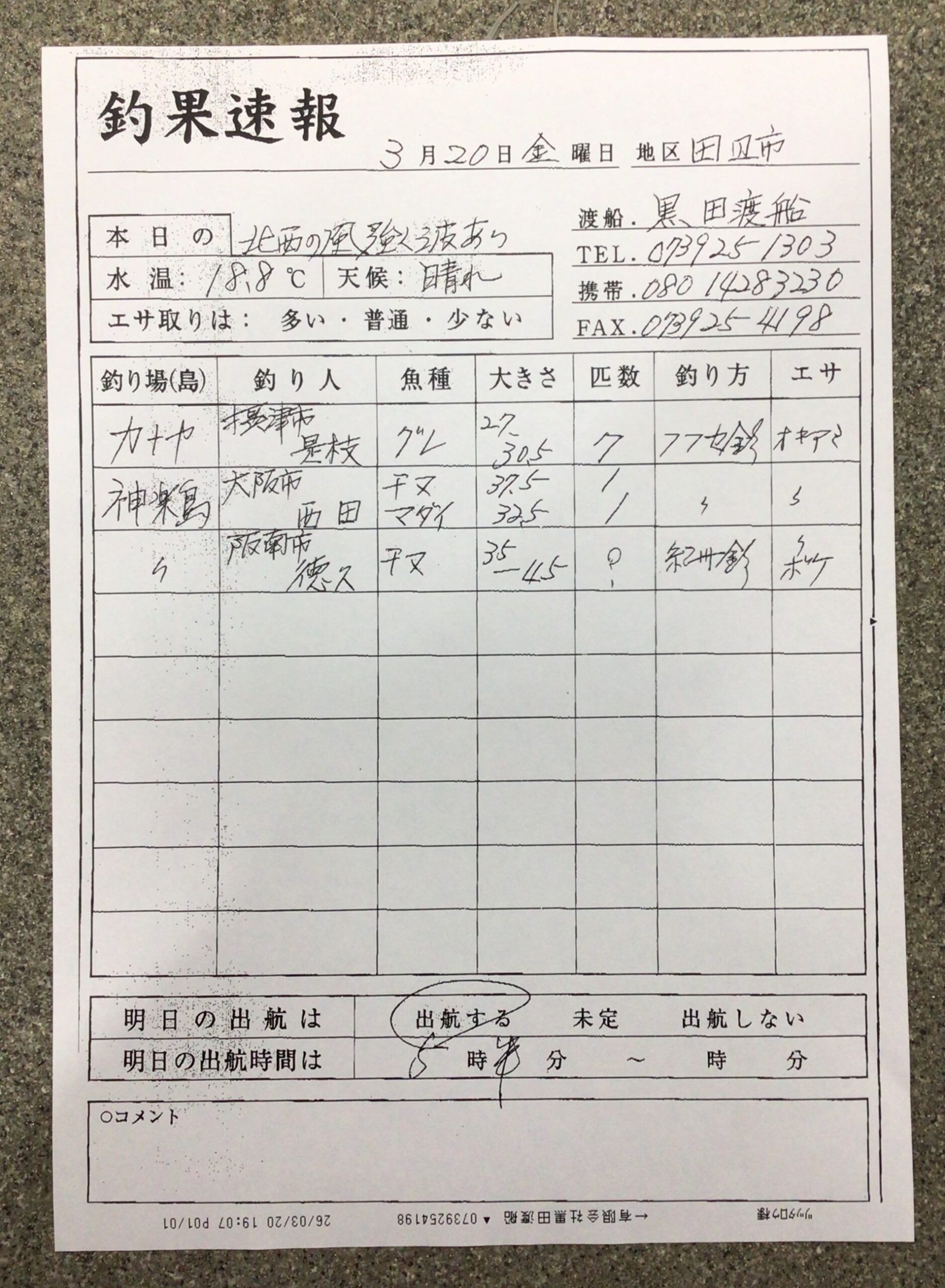 田辺・黒田渡船さん3/21(土)出航時刻いつもより早いようです