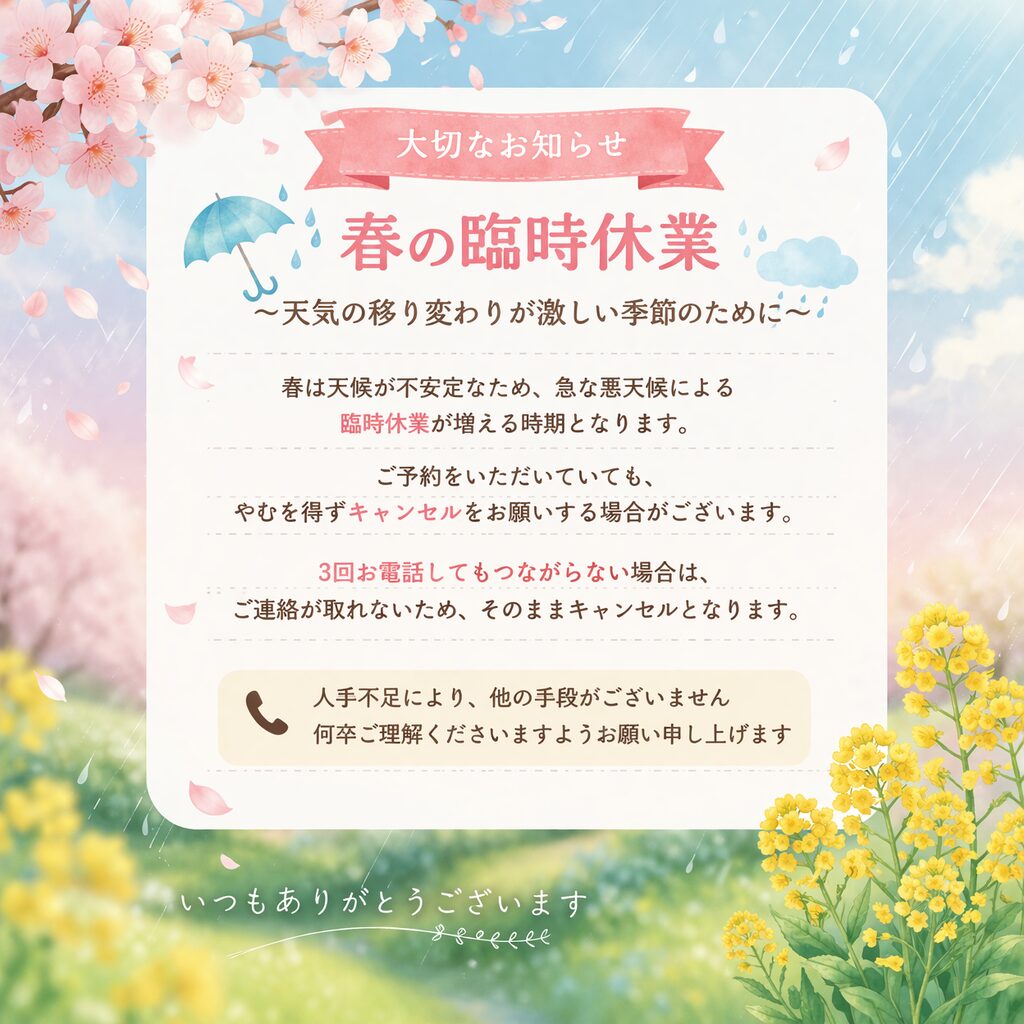 そんな影響で、急な臨時休業をお願いせざるを得ない日がどうしても増えてしまっています。