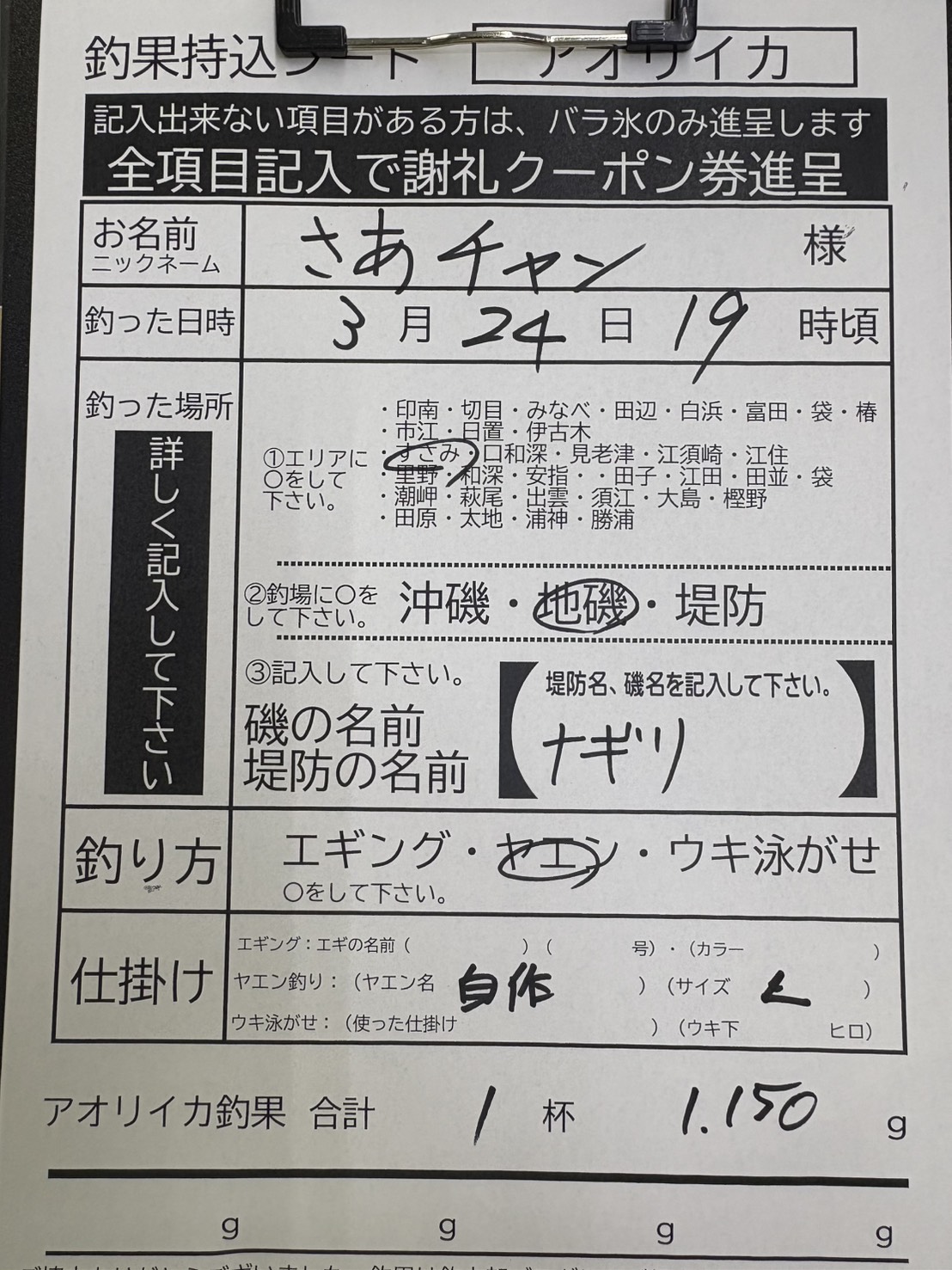 3/24 アオリイカの釣果 1150g すさみ名切り、ヤエン釣りにて