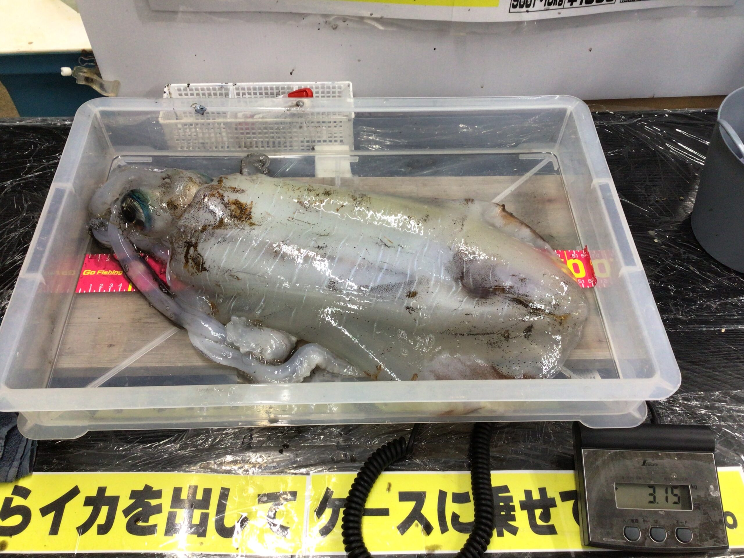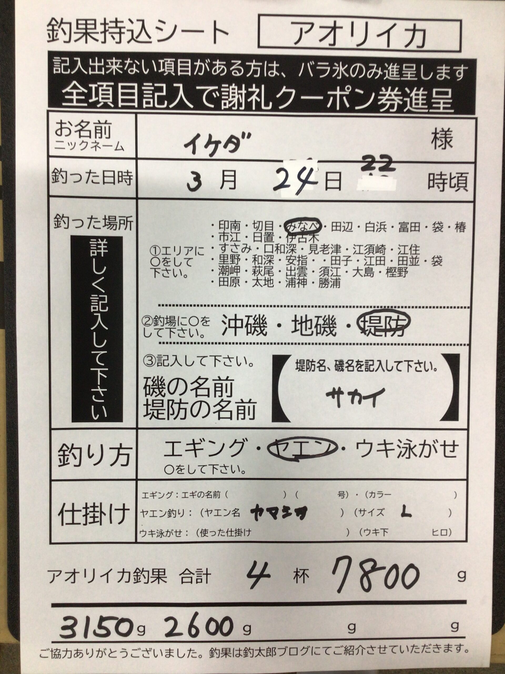 3月24日 イケダ様 アオリイカの釣果。3150g 4杯で7・8キロ。みなべ町堺漁港にて。