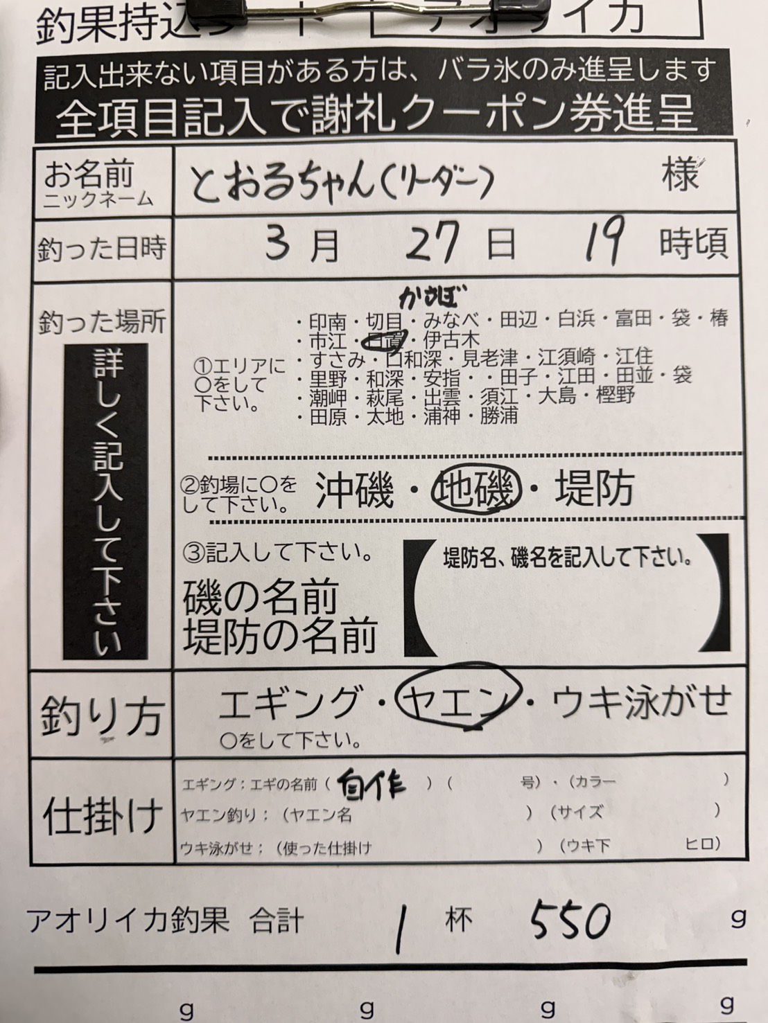 3/27 白浜笠甫(かさぼ)地磯にてヤエン釣りでアオリイカ1杯の釣果