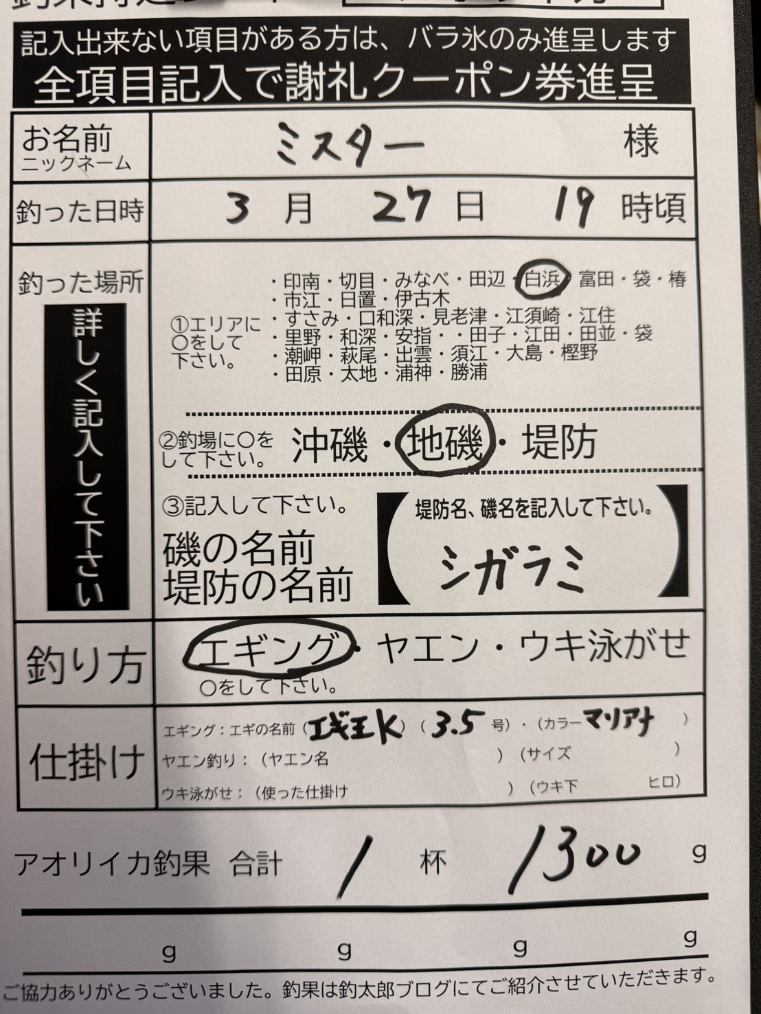 3/28 みなべシガラミ磯にてエギングでアオリイカ1.3キロの釣果