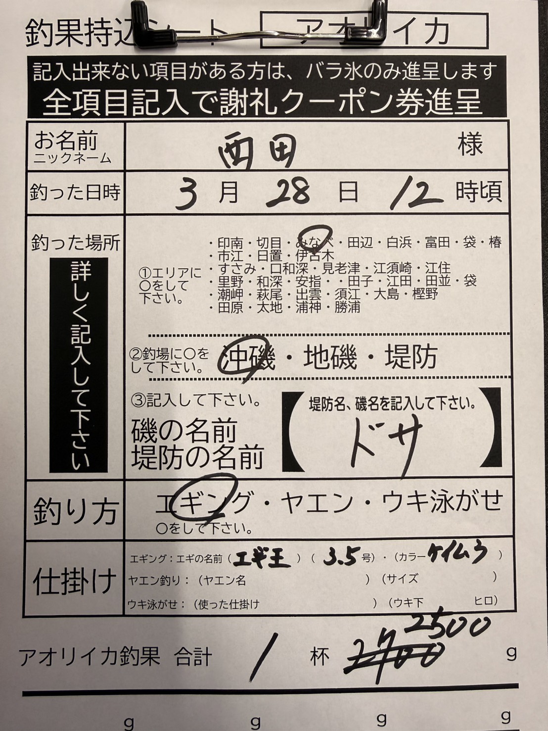 3/28 みなべ沖磯でエギングにてアオリイカ2550gの釣果