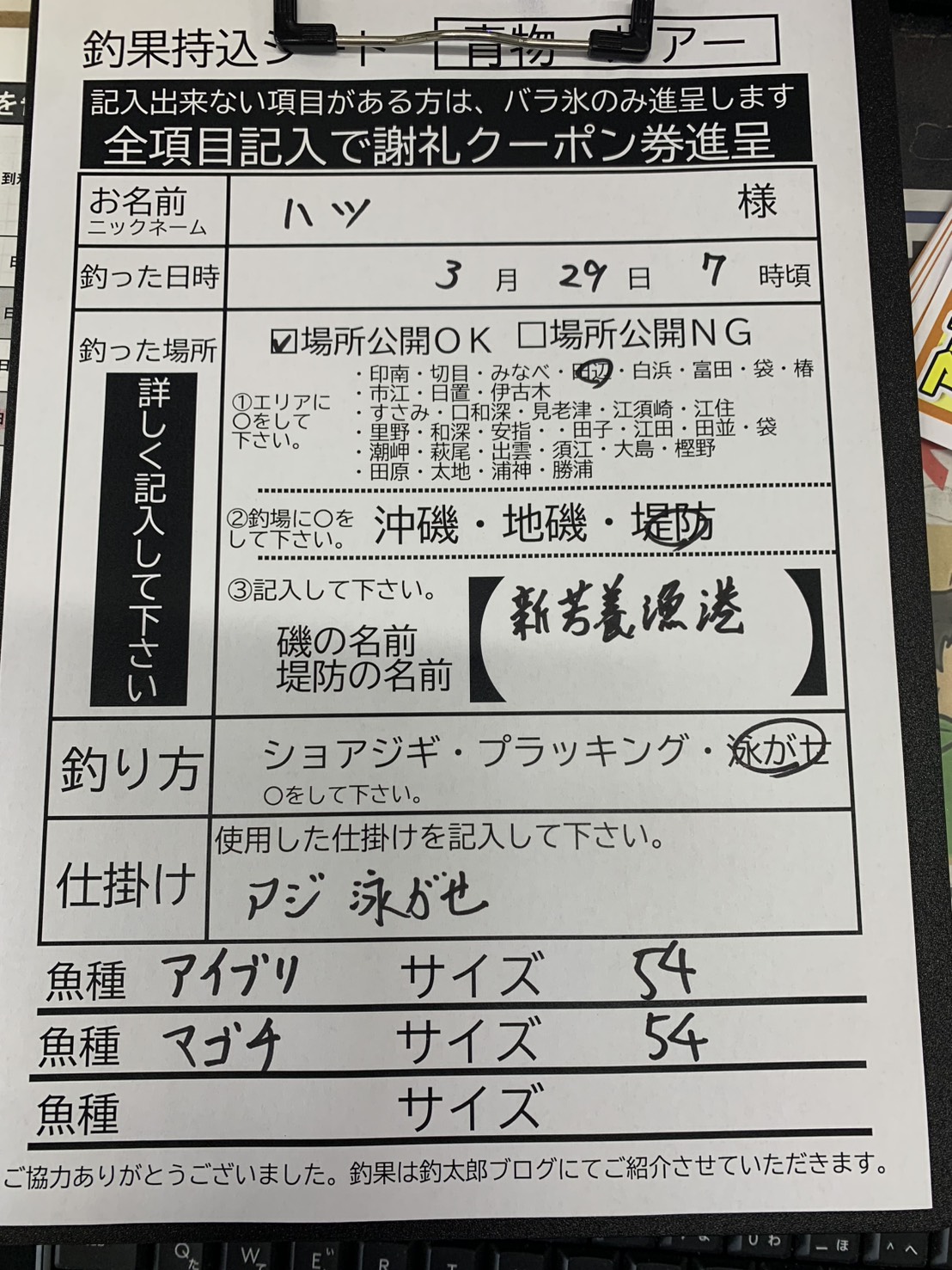波止釣り・サーフ釣り釣果