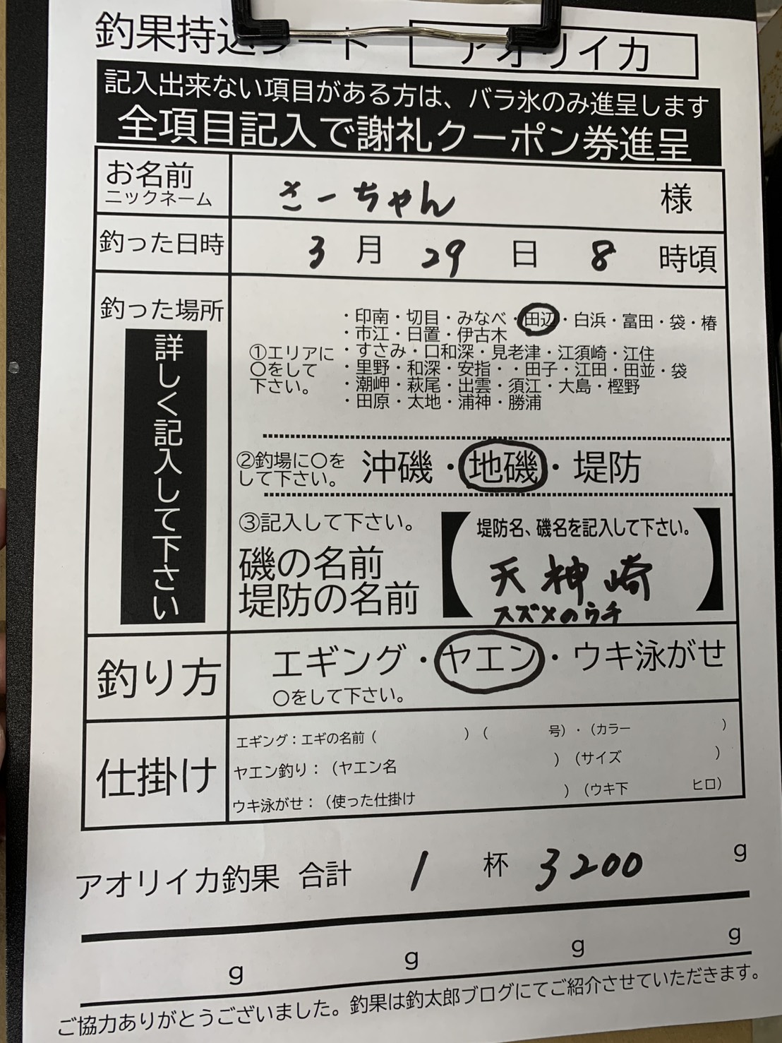 3/29 アオリイカの釣果3200g 天神崎スズメノウチ、ヤエン釣りにて
