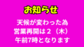 臨時休業、天気変更で2日木曜日午前7時営業再開となります。