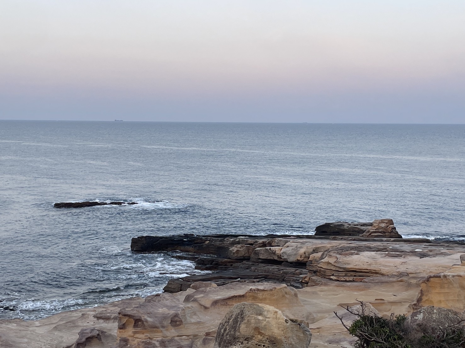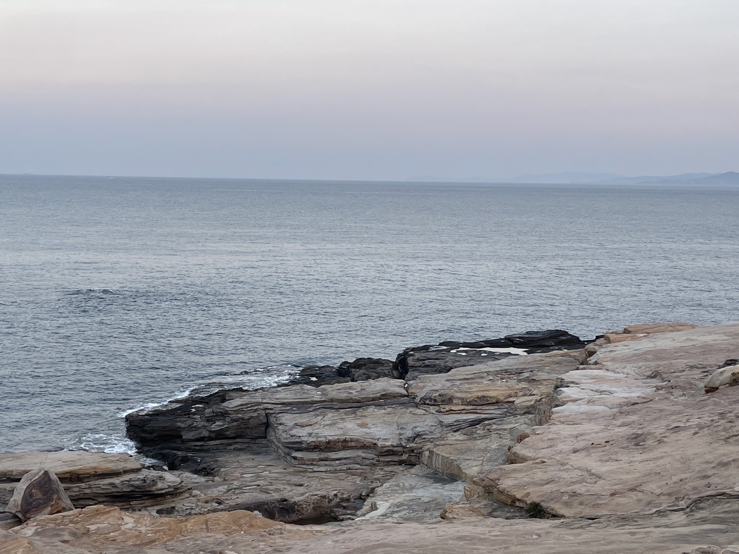 今朝の白浜千畳敷は風が全くありません。 波も穏やかで、釣り人もいるようです。 気温は7度と、少し冷えています。