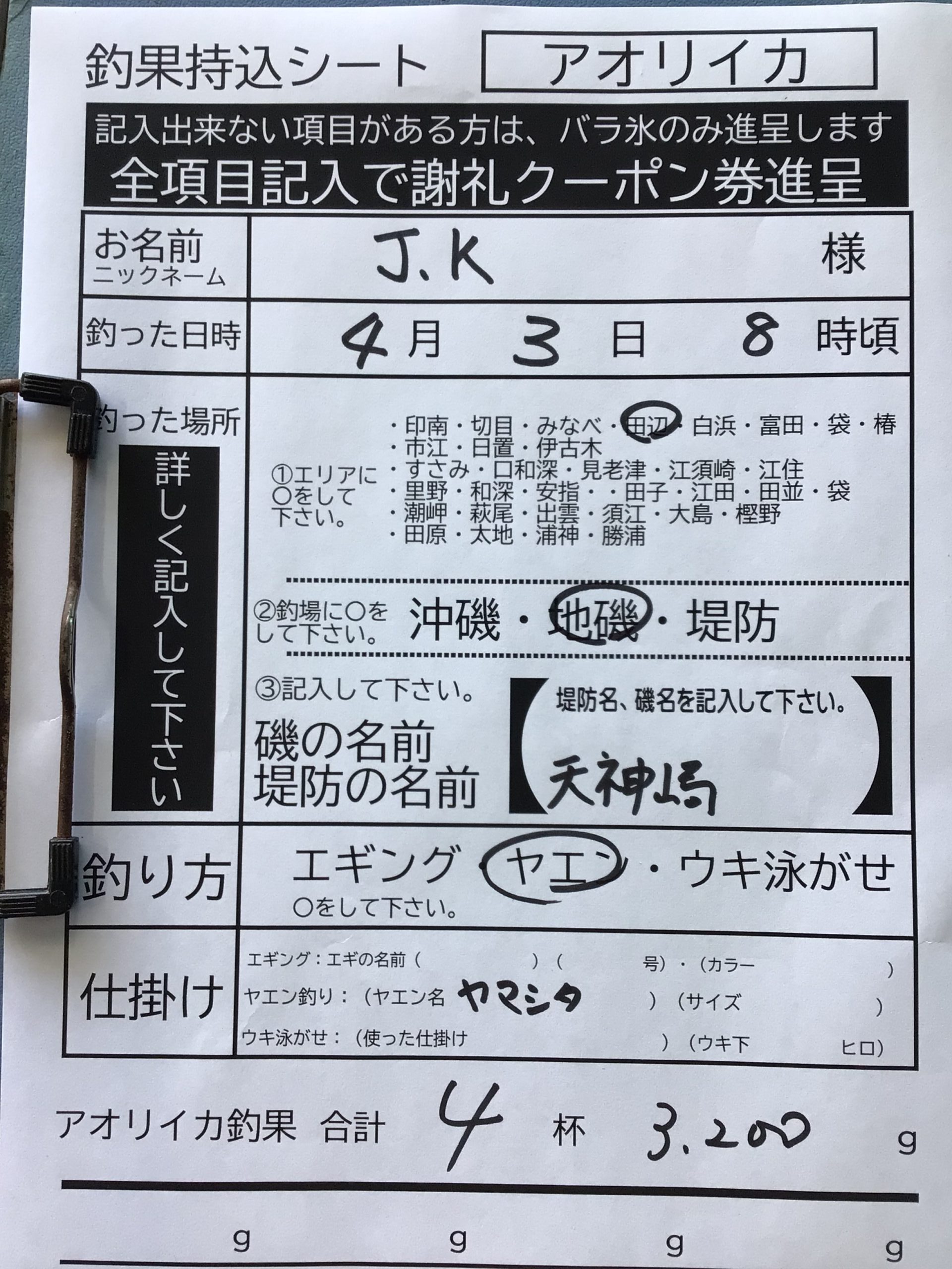4/3 アオリイカの釣果 田辺市天神崎 4杯で3,200g ヤエン釣りにて