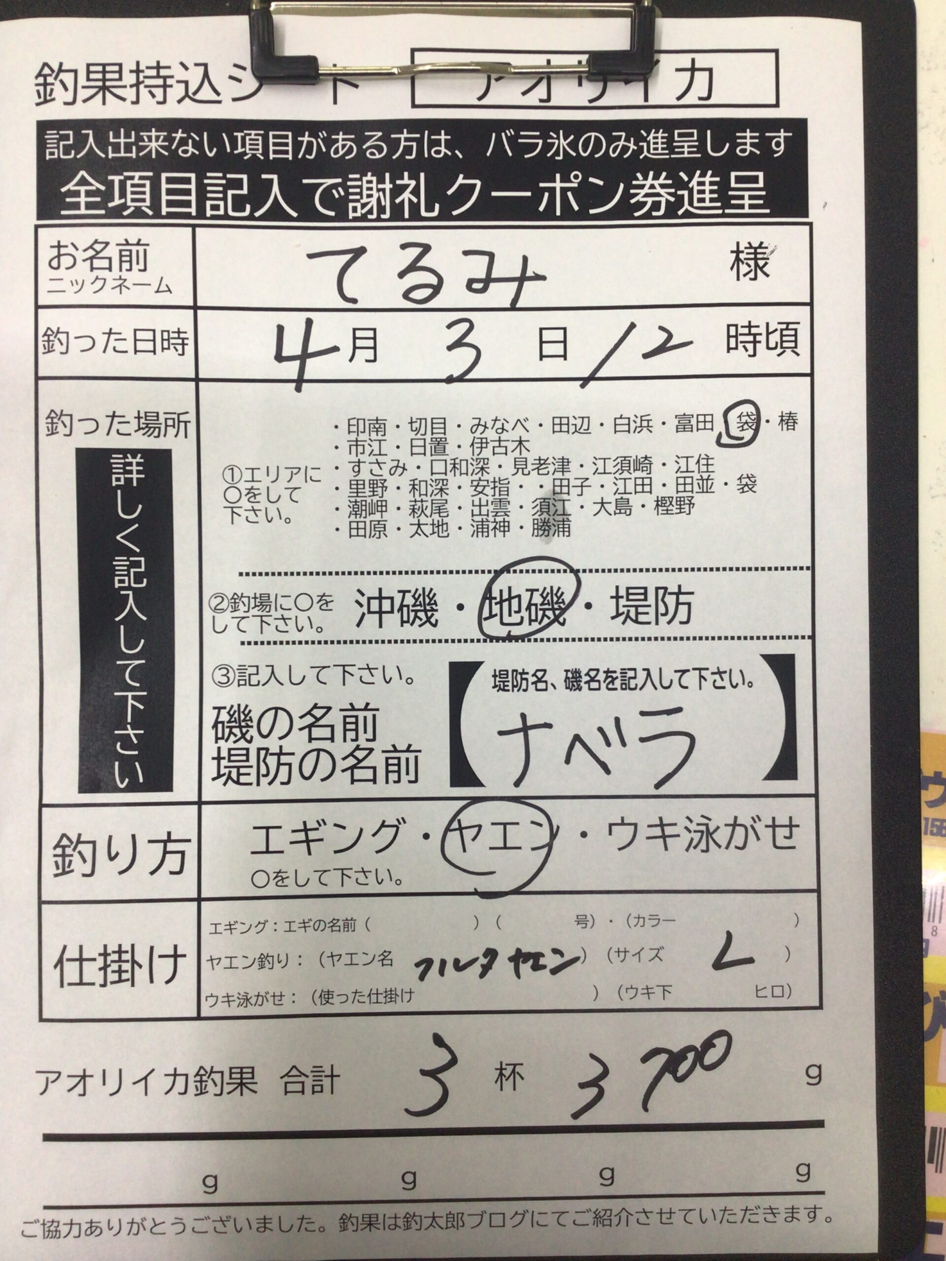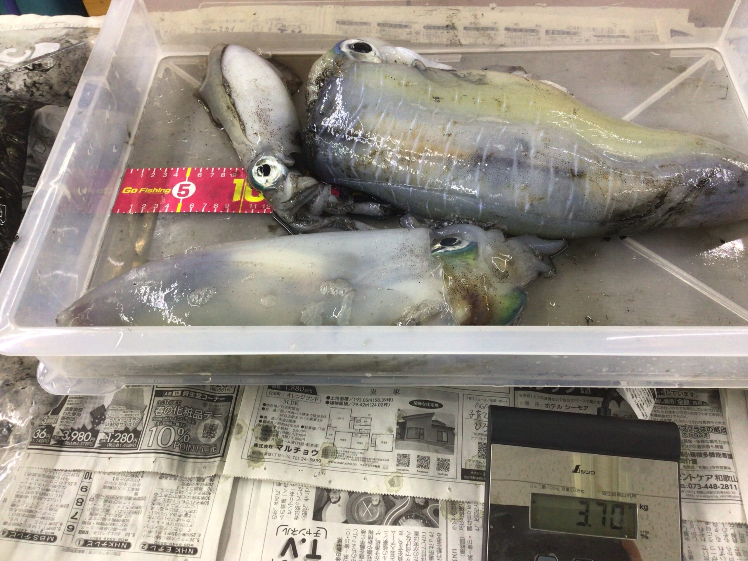 4/3 アオリイカの釣果 3700g 袋(ナベラ)、ヤエン釣りにて