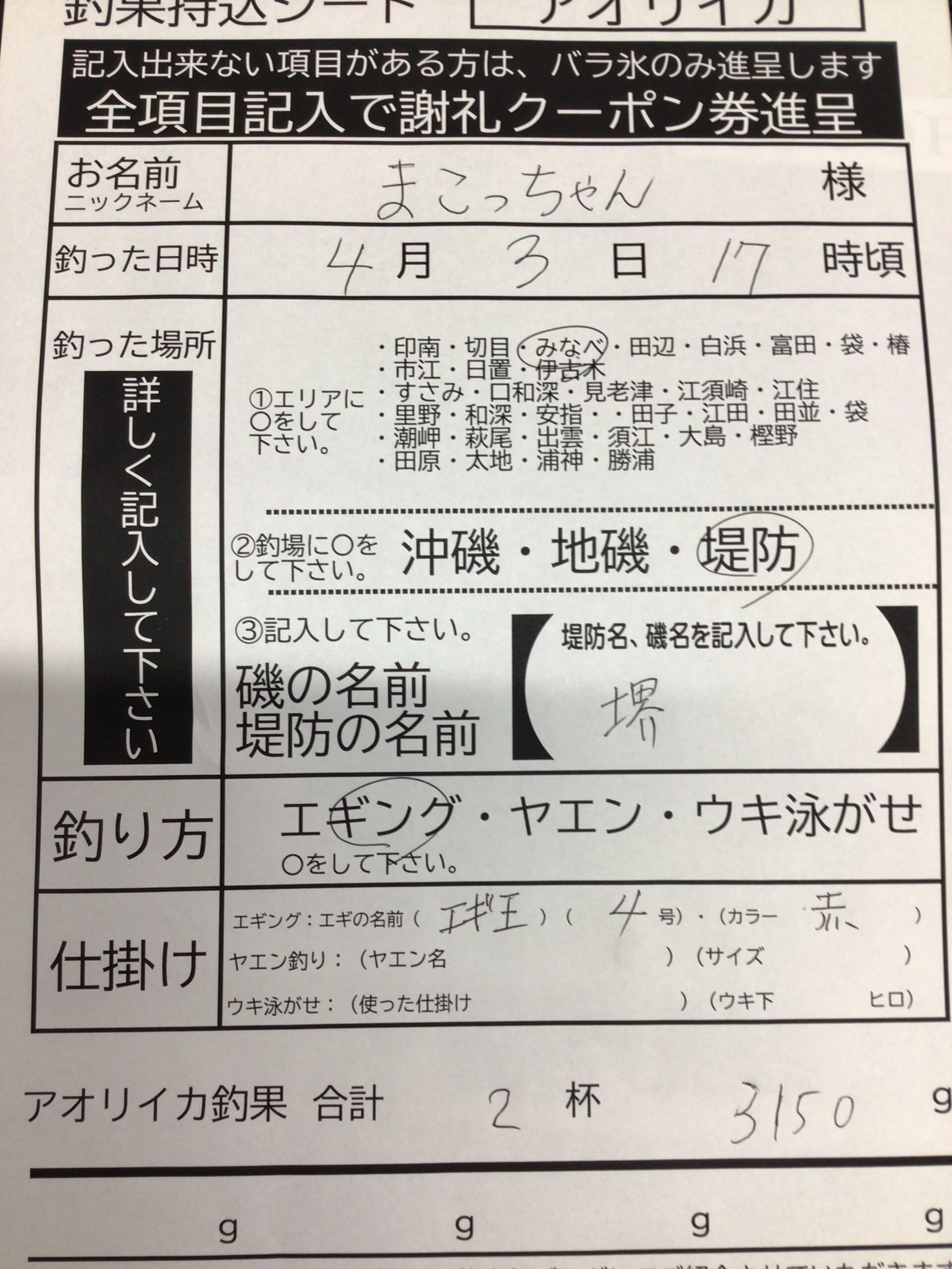 4/3 アオリイカ 2杯で3150g堺釣り場にて