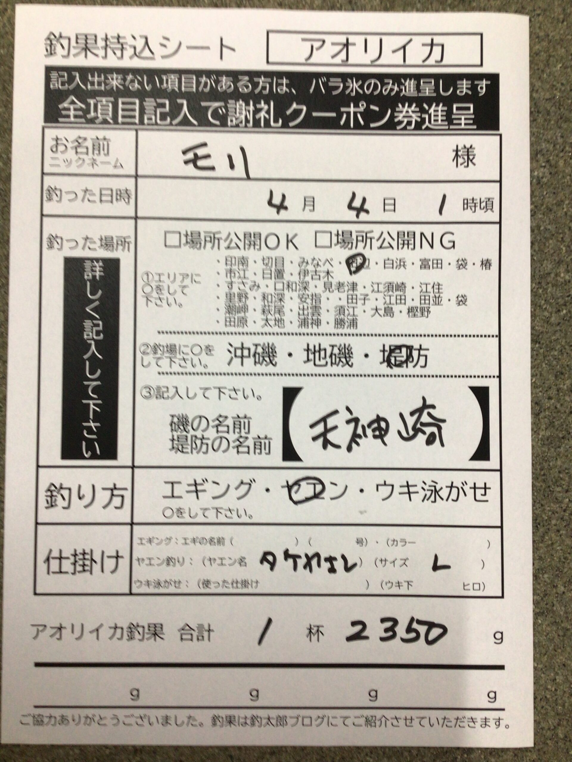 4月4日 モリ様 アオリイカの釣果。2350g 田辺市天神崎堤防にて。