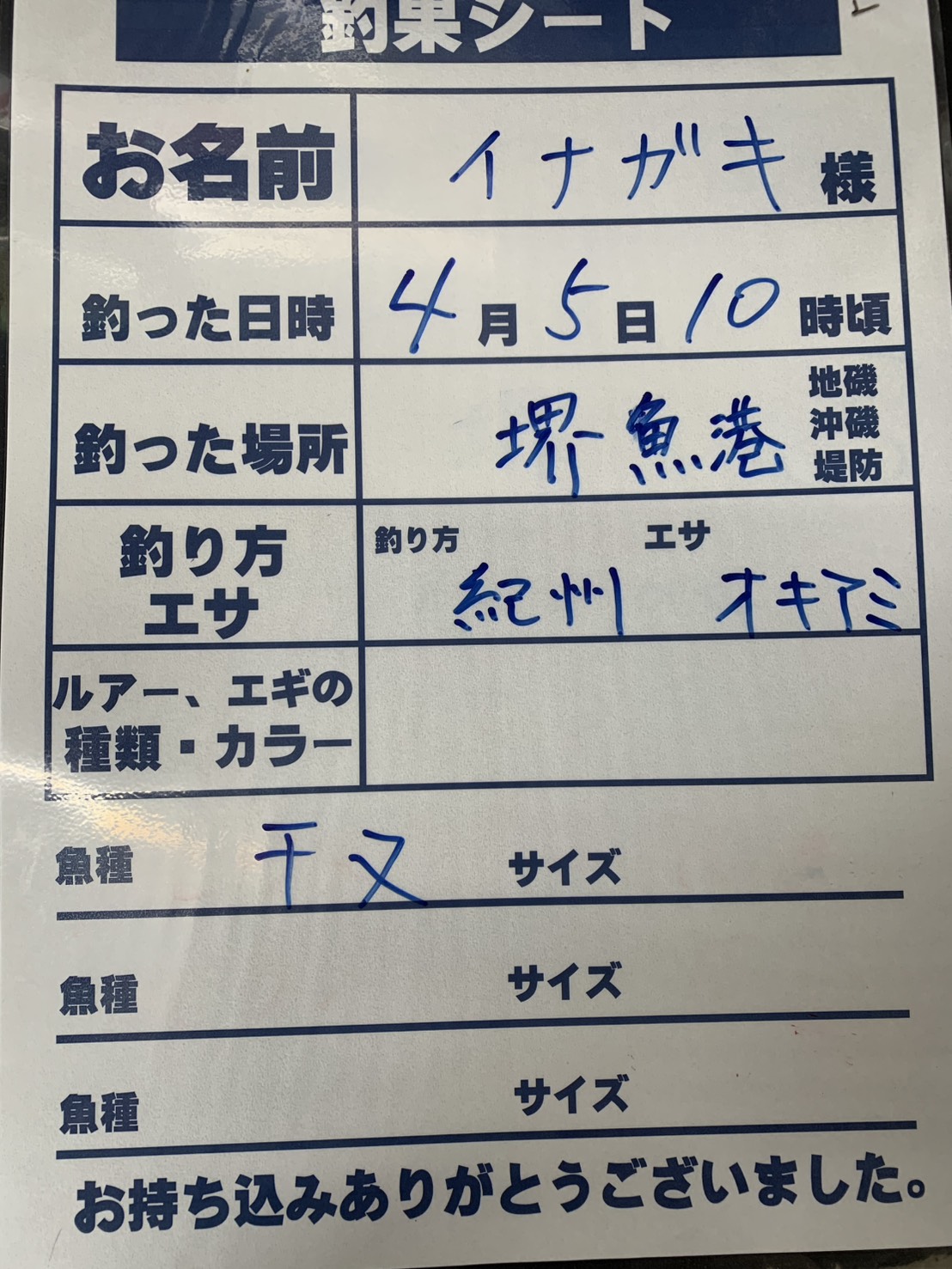 4/5 堺漁港ドッグ側堤防にてチヌ3枚の釣果 紀州釣り