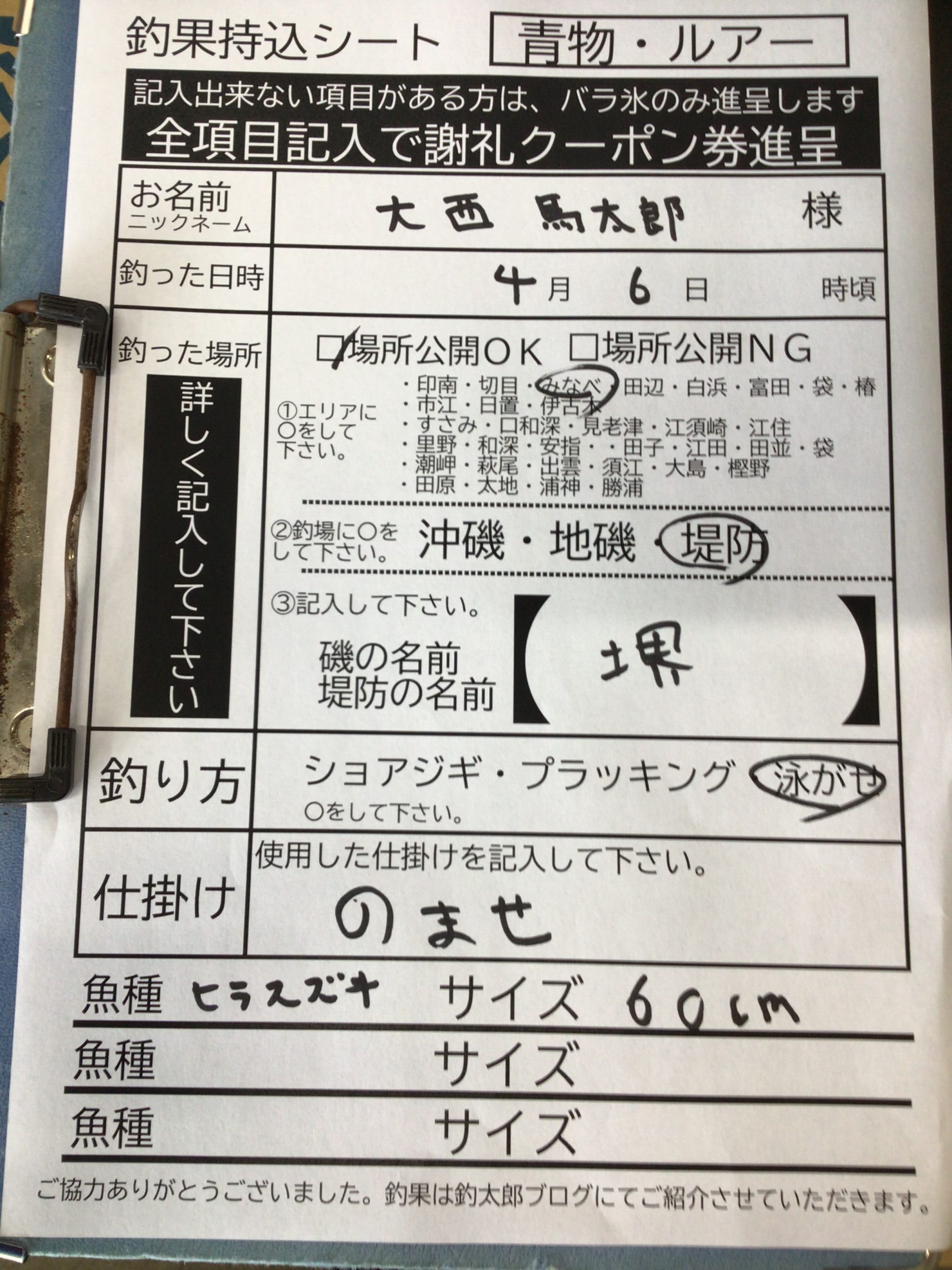 4/6(月) ヒラスズキ 60cmの釣果 みなべ町堺漁港にて