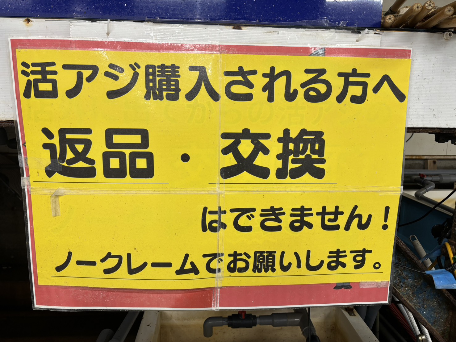 活アジはノークレームでお願いします。 お知らせ 2026.04.08 活アジはノークレームでお願いします。 返品・交換はできません。 釣り場に着いたら死んでいた。 死んだアジ持っていくから交換して。等は受け付けておりませんのでご了承ください。 他にも、自分で入れさせてくれ。選ばせてくれ。 大きいの、小さいの等指定できません。 アジを入れるのはスタッフが行いますのでお客様自身で入れることはできません。