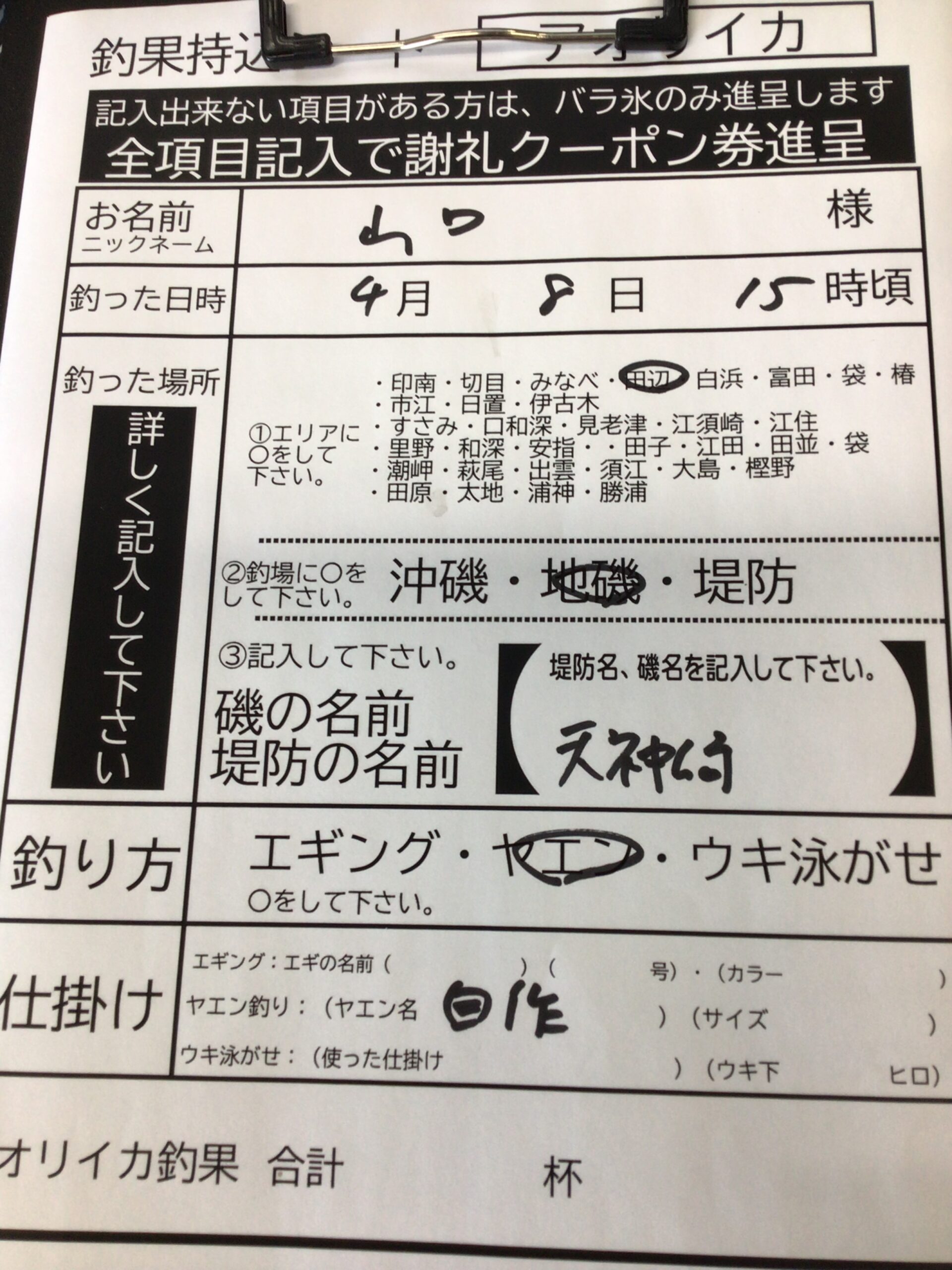 4/8田辺天神崎でアオリイカ1050gヤエン釣り釣果