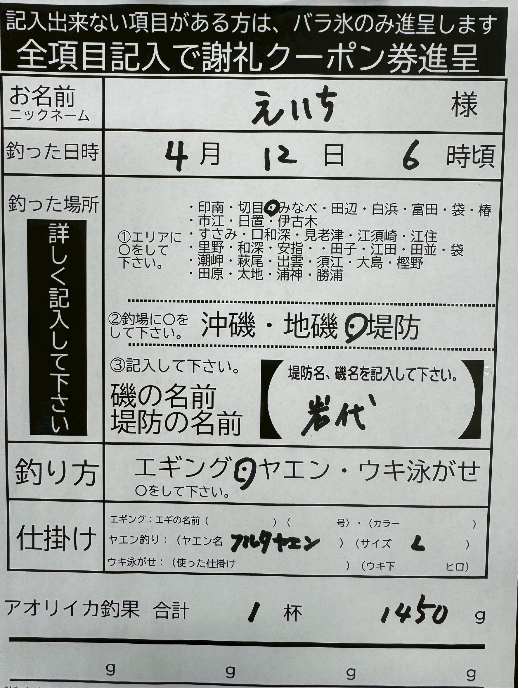 フルタヤエンLで釣ったアオリイカ1450g。岩代堤防で。エイチ様