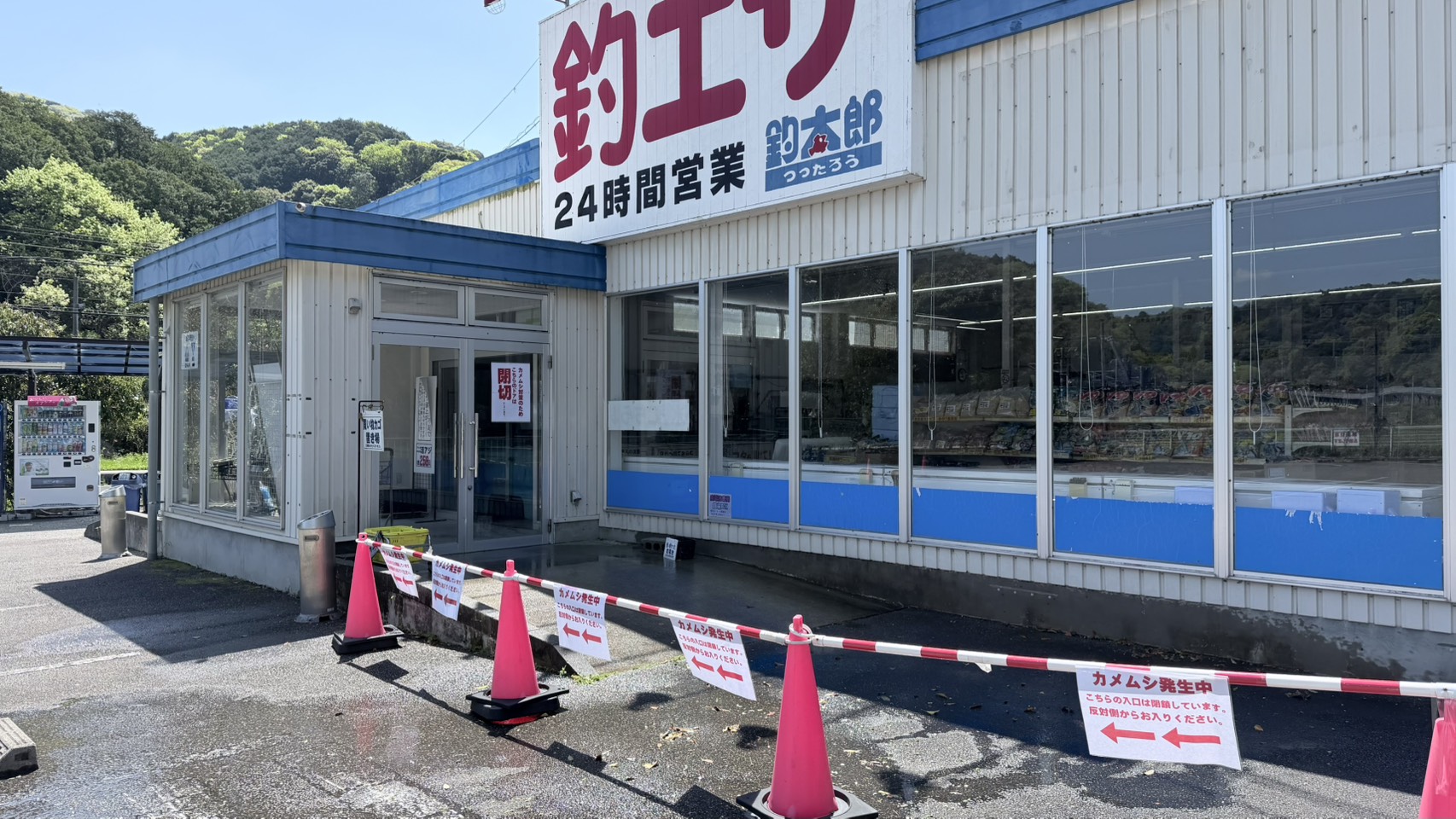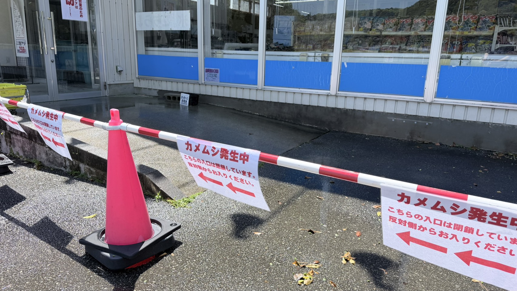 白浜店は夜間カメムシが多すぎるので、入口1つを閉め切りにしています。