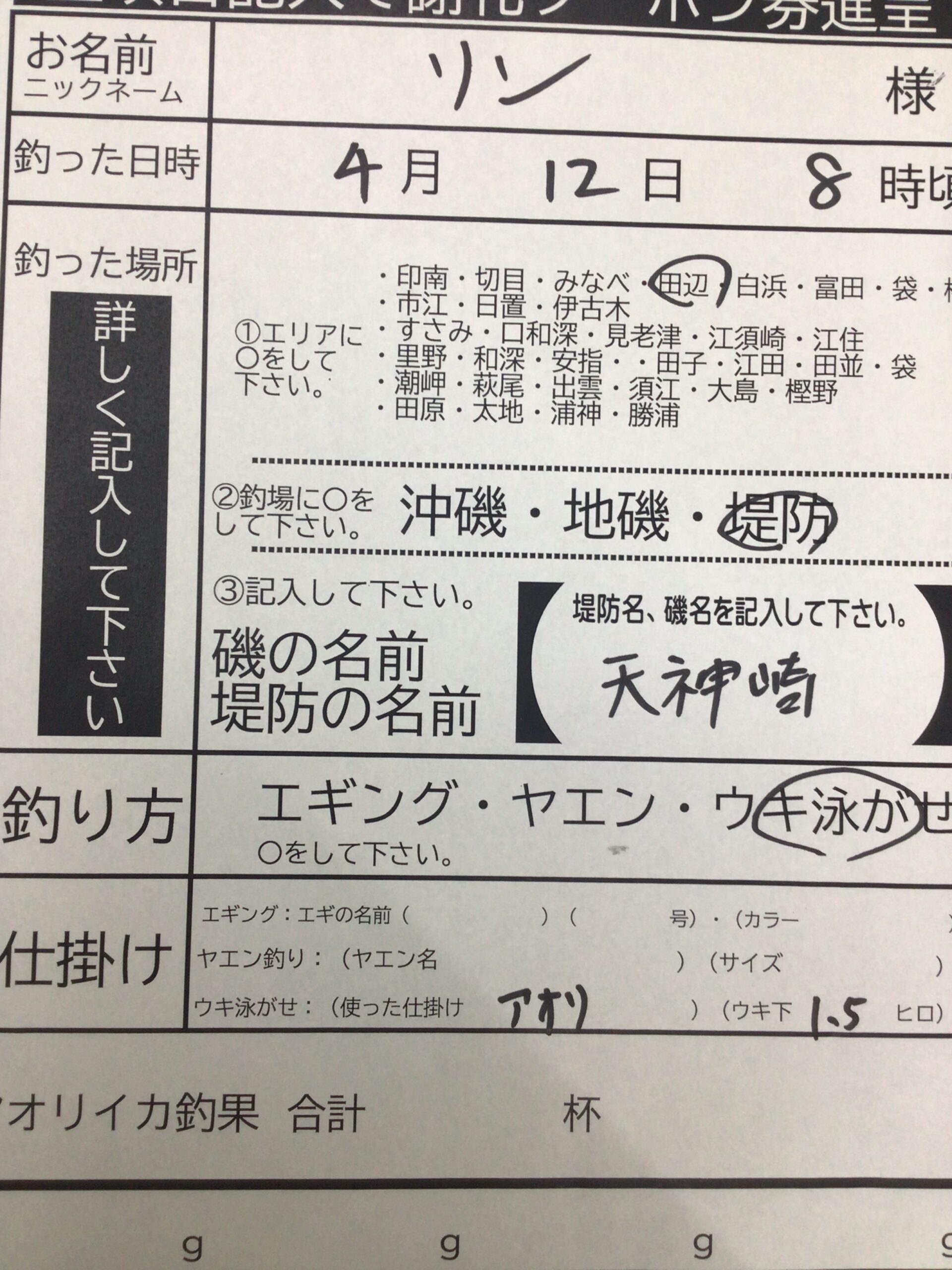 4/12 アオリイカの釣果 1500g 田辺天神崎、ウキ釣りにて