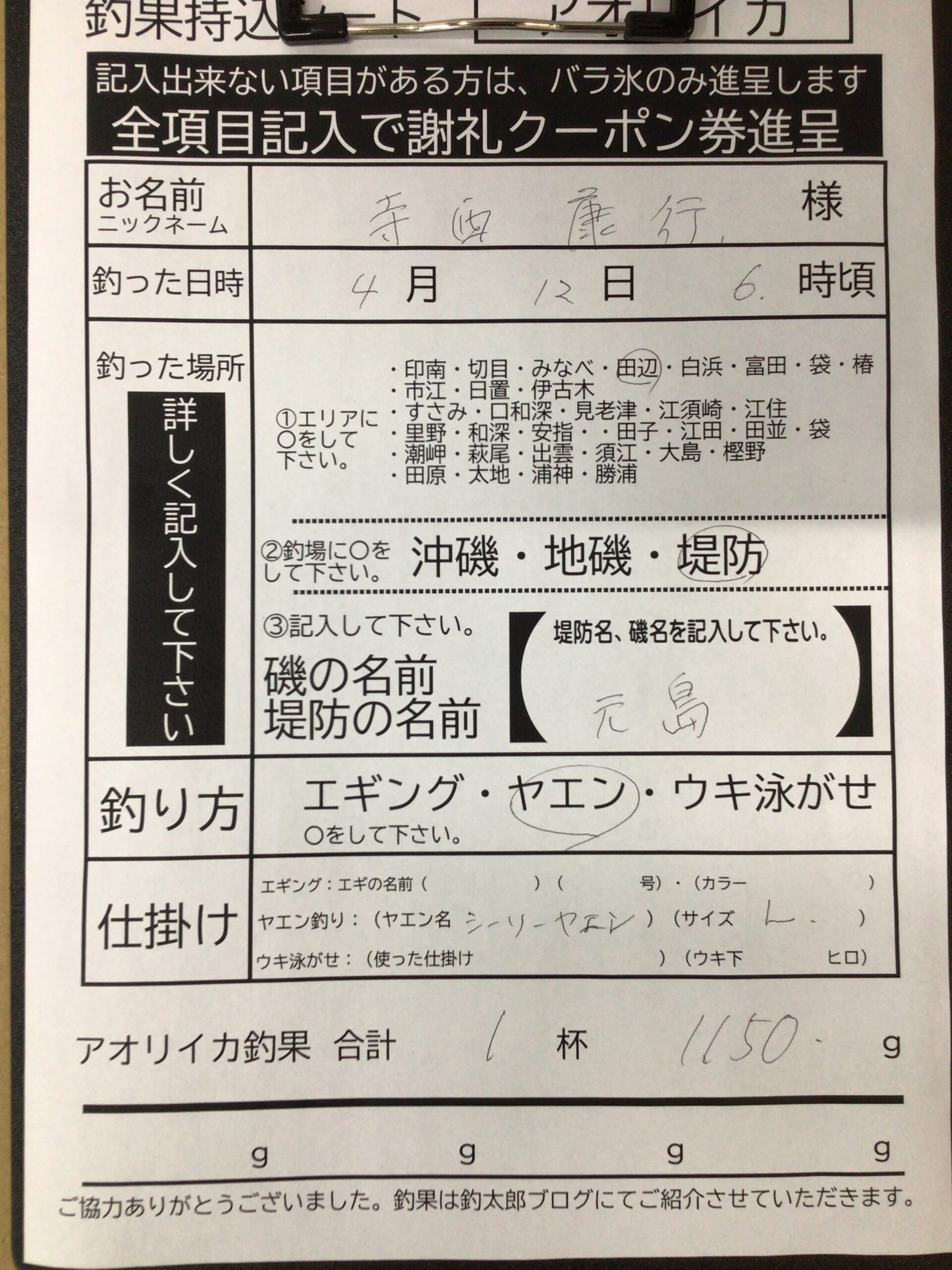 4/12(日)寺西康行様 アオリイカ1150g釣果 元島堤防 ヤエンにて
