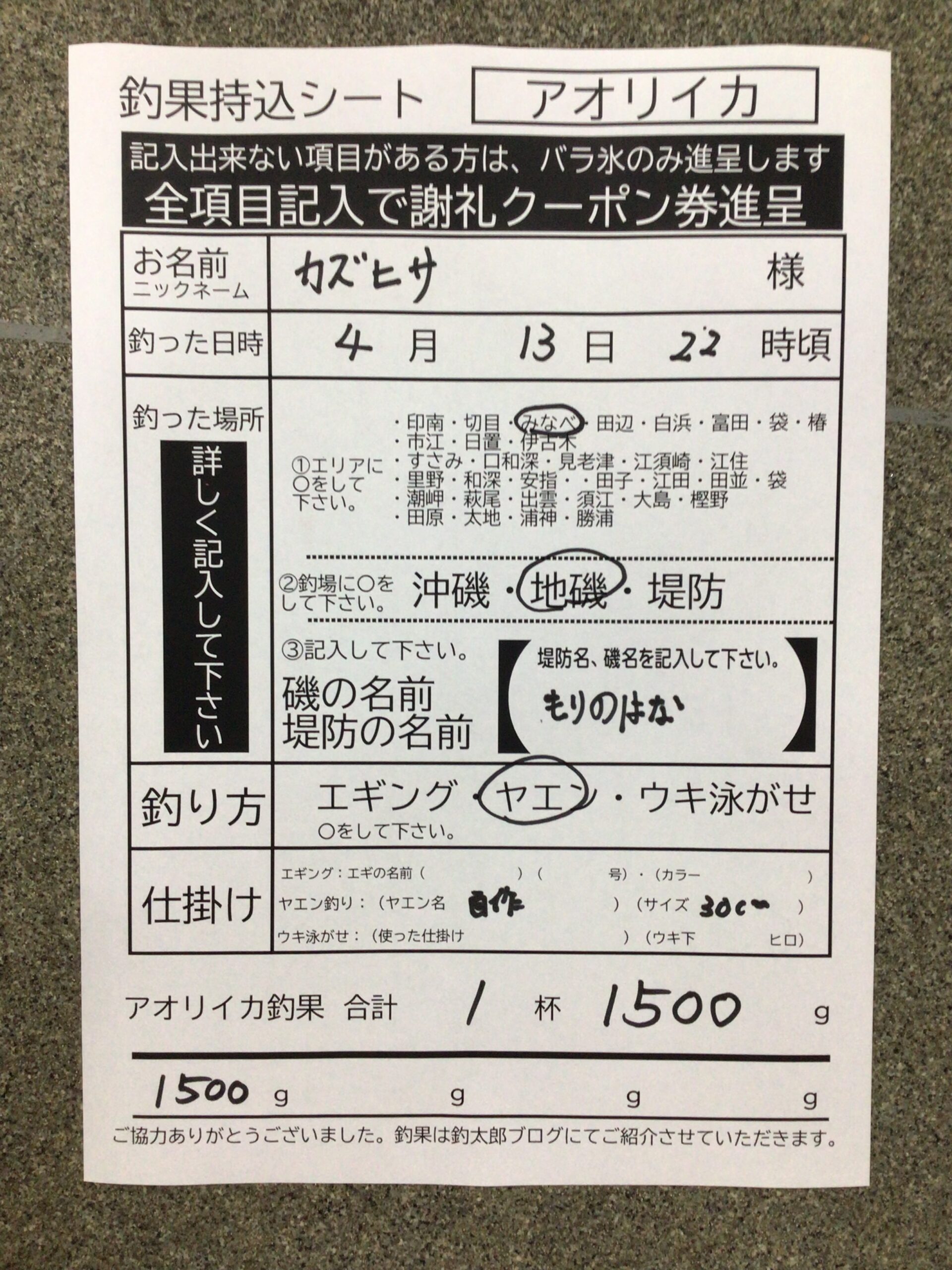 4月13日 カズヒサ様 アオリイカの釣果。みなべ町堺 森の鼻にて。