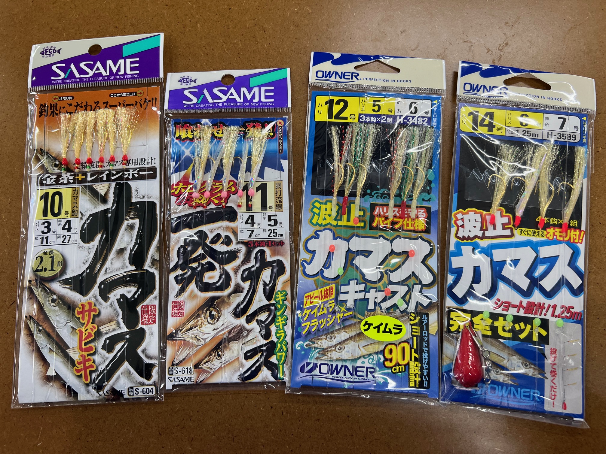 ①ささめ針の「カマスサビキ(金茶+レインボー)」です。