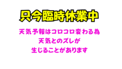 お知らせ 只今臨時休業中! 天気予報はコロコロ変わる為、実際の天気とズレが生じることがあります。