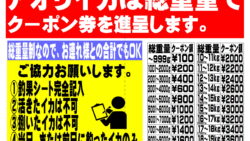 お知らせ アオリイカお持ち込み下さい。バラ氷とクーポン券進呈中【釣太郎】