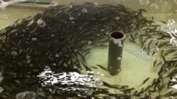お知らせ 流れに逆らうように整然と、綺麗に並ぶようにして泳ぐアジ。アオリイカ釣り用。
