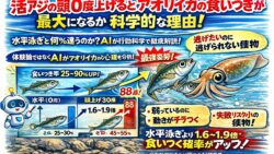 アオリイカ生態、釣り情報関連 活アジの頭を30度上げると、なぜアオリイカの食いつきが最大になるのか? 水平泳ぎとの差は何%?AIが行動科学で解説すします。
