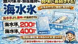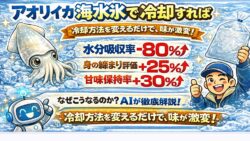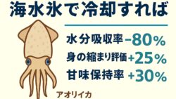 アオリイカ生態、釣り情報関連 アオリイカを海水氷で冷却すると、水分吸収率−80% 身の締まり評価+25% 甘味保持率+30%