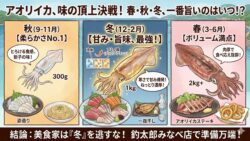 アオリイカ生態、釣り情報関連 【アオリイカの味覚比較】春・秋・冬、一番美味しいのはいつ?旨味成分(アミノ酸)と食感から導き出した「最強の季節」とは?