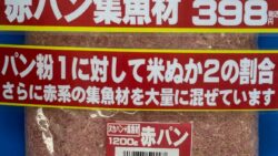 パン粉1に対して米ヌカ2の割合+赤系集魚剤を混ぜた、釣太郎オリジナルグレ(メジナ)集魚材「赤パン」は1200gで398円税込。