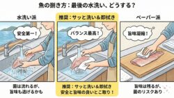 魚料理 魚を捌くときは、最後に水洗いするが、水洗いなしでキッチンペーパーパーだけだと危険性がある?