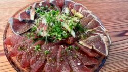 魚料理 カツオのカルパッチョ作りました~ 丸皿に並べて薬味とオリーブオイルを掛けるだけの簡単料理です