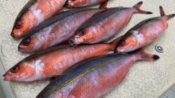 船釣りの釣果 金色のコガネスズメダイの塩焼き。 外道魚ですが、最上級の美味しさでした。