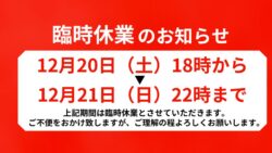 お知らせ 【臨時休業のお知らせ】20日(土)の18時から21日(日)の22時まで休業いたします。