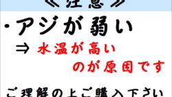 お知らせ 海水温度が高い時期は、活アジが弱るのが早いのです。ご了承ください。