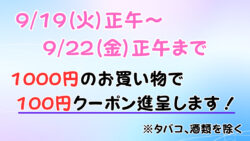 お知らせ 休業続きのお詫びとして、9/19(火)正午よりクーポンのサービスを行います。