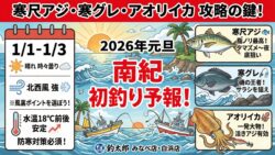 お知らせ 【2026年元旦】南紀の初釣り天気予報!正月三が日の風と水温は?寒尺アジ、寒グレ・アオリイカ攻略の鍵