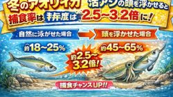 アオリイカ生態、釣り情報関連 アオリイカはなぜ「頭が浮いたアジ」を狙うのか?捕食率激増の理由をAI視点で考察【ヤエン・泳がせ釣り】