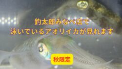 アオリイカ生態、釣り情報関連 多くの人が立ち止まり、見入っておられる「アオリイカ水槽」。釣太郎みなべ店で飼育しています。