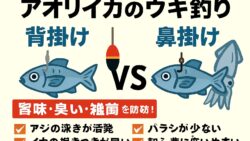 アオリイカ生態、釣り情報関連 アオリイカのウキ釣り、背掛けは泳ぎ重視、鼻掛けは安定性重視。
