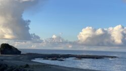 海況状況 今朝の日置はポツポツと雨が降り 厚い雲に覆われて暗いです。波が少し高く、 海岸は波の音が大きく聞こえます。