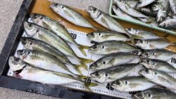 波止釣り・サーフ釣り釣果 平日でも田辺新芳養漁港は尺アジ狙いの釣り人で賑わっています。