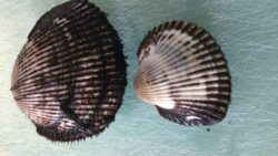 雑学 右の赤っぽい方がアカガイ。筋は40本入っています。底物魚釣りエサ二枚貝紹介。